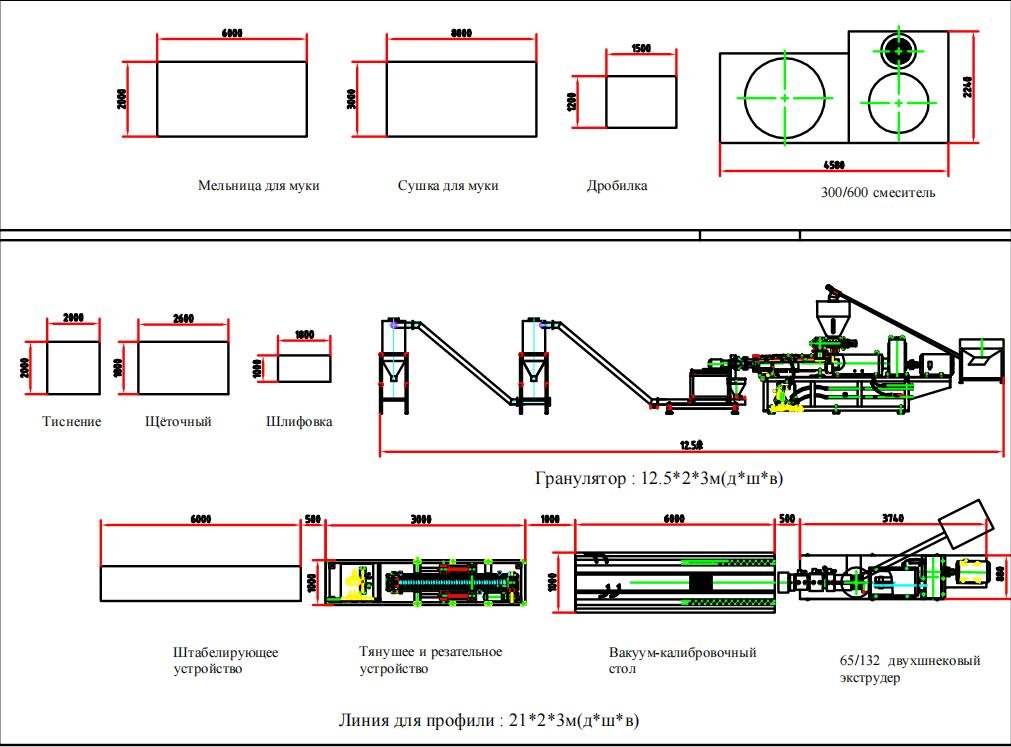 Экструзионная линия предназначена для производства профилей, дверей, досок, панелей и др., из готового ДПК гранулята на основе ПВХ - поливинилхлорид (PVC), ПЭ – полиэтилен (PE), ПП - полипропилен (PP).