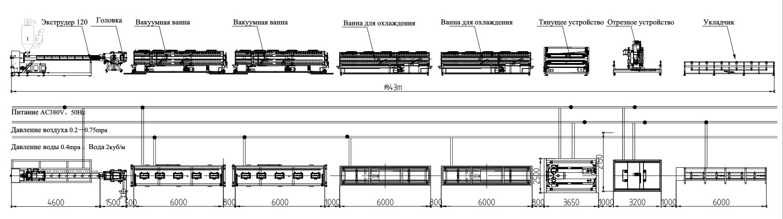 Далее, в процессе калибровки, заготовка попадает в вакуумную ванну, где окончательная формировка трубы происходит в результате давления, прижимающего заготовку к калибровочной форме.
